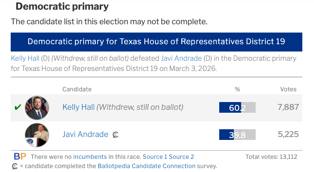 In the Texas House District 19 Democratic primary (next door to the District I ran in), a candidate who reportedly believed he had stepped aside from the race still ended up winning the nomination. He (Kelly Hall) had spent only about $750 covering filing fees, put up no yard signs, and did little of any traditional campaigning. No website. And yet he won by nearly 20 points. In mid-January, Kelly changed his mind to not run for Texas House and decided to run for mayor of Round Rock.