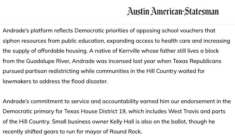 Meanwhile, the opponent he defeated (Javier Andrade) was an Army veteran and cybersecurity professional who had received the endorsement of the Austin American-Statesman.