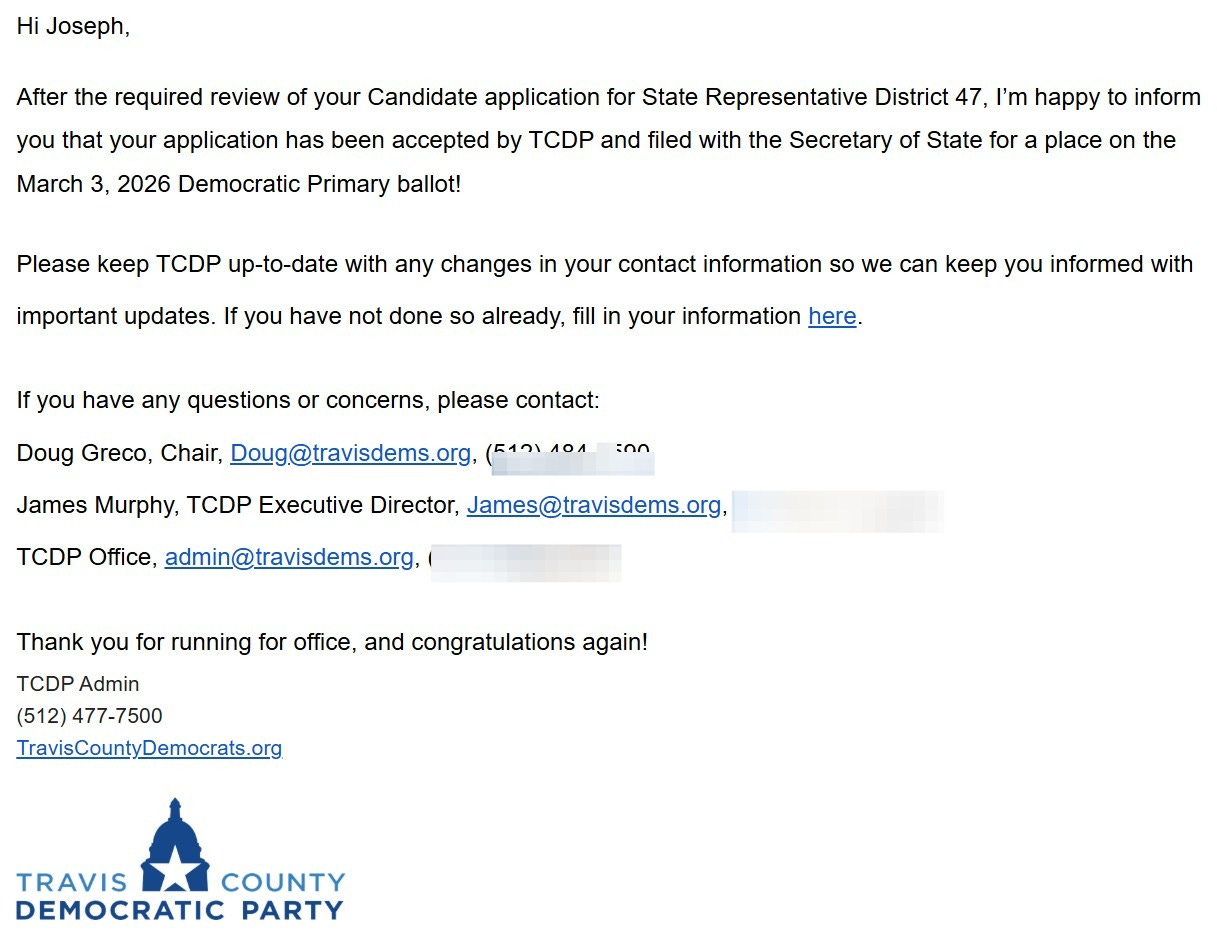 Early voting begins February 17, 2026—just 71 days from the day I filed. We need to move quickly and build a serious team to meet this moment.