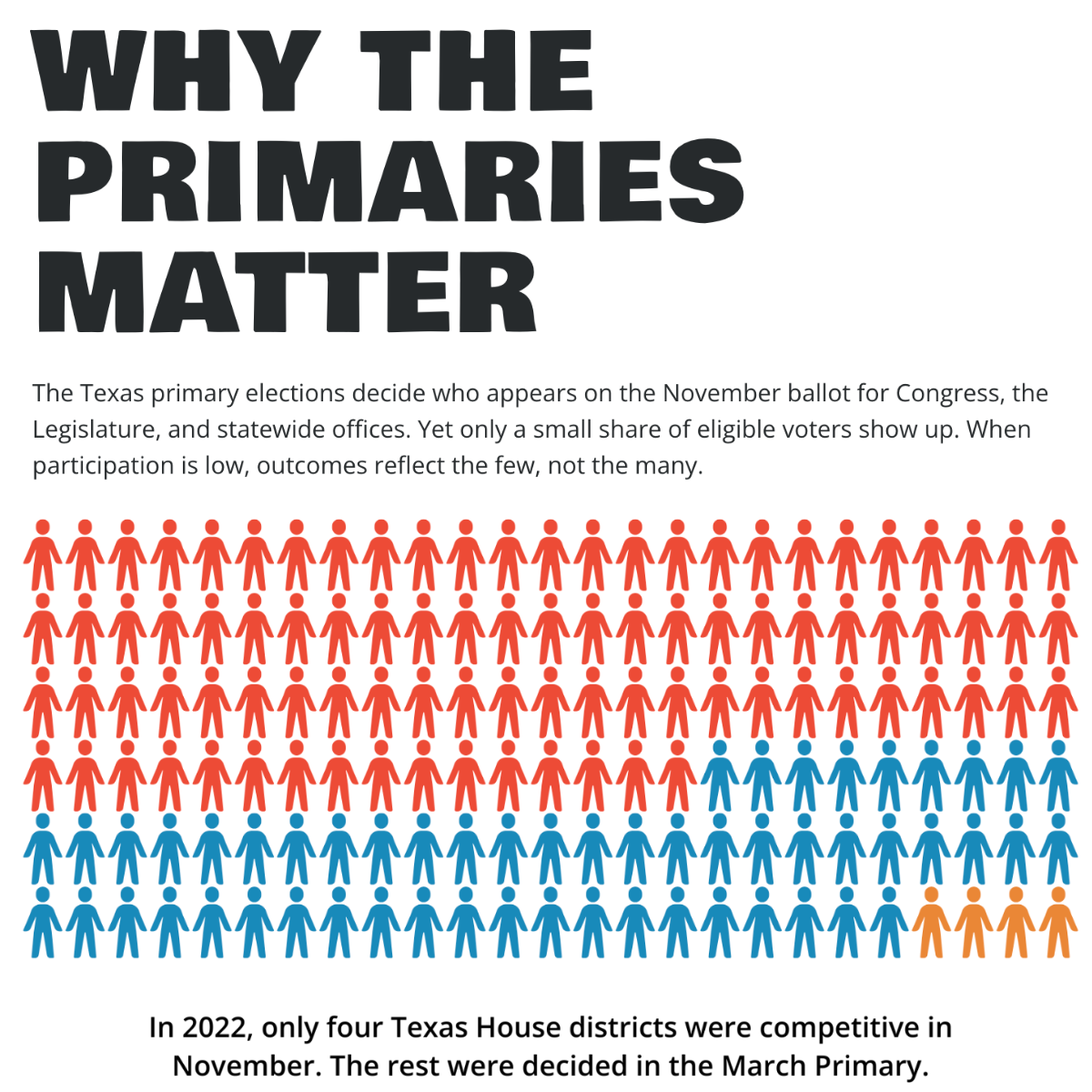 Consider this: since 1998, Texas primary elections have decided all 27 statewide offices and 145 of the 150 legislative seats. That means primary turnout doesn’t just influence politics—it largely determines it.